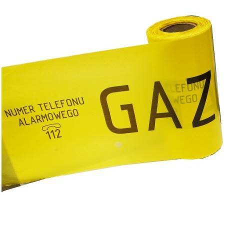 Folia żółta z nadrukiem GAZ o następujących parametrach: szerokość 20 cm, nadruk GAZ, zgodnie ze standardem ST-IGG dla gazownictwa z 2011 r. standardowy nawój 100 mb